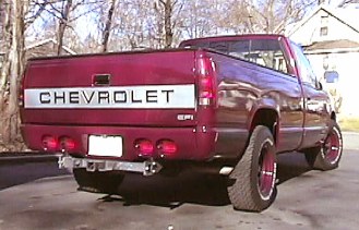 The stock 15" Chevy wheels were replaced by steel "American Racing" wagon wheels, which were painted "brandywine red" to match the truck.